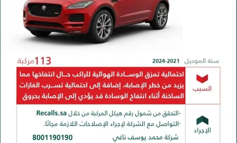 أعلنت وزارة التجارة عن استدعاء (113) مركبة جاكوار “E Pace”, موديل 2021 إلى 2024، لاحتمالية تمزق الوسادة الهوائية للراكب حال انتفاخها، مما يزيد من خطر الإصابة، إضافة إلى احتمالية تسرب الغازات الساخنة أثناء انتفاخ الوسادة، قد يؤدي إلى الإصابة بحروق.