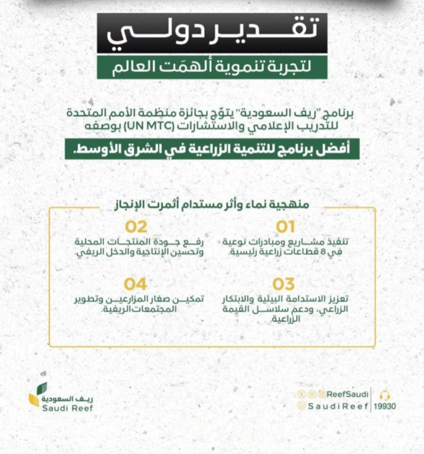 تُوِّج برنامج ريف السعودي بجائزة أفضل برنامج للتنمية الزراعية في الشرق الأوسط من منظمة الأمم المتحدة للتدريب والإعلام والاستشارات (UN MTC)، في إنجاز يؤكد مكانة المملكة العربية السعودية كنموذج عالمي في التنمية الزراعية المستدامة. وقد جرى اعتماد الجائزة رسميًا من أبوستيل أوروبا، بما يعزز الاعتراف الدولي بالممارسات الزراعية النوعية التي تقدمها المملكة.