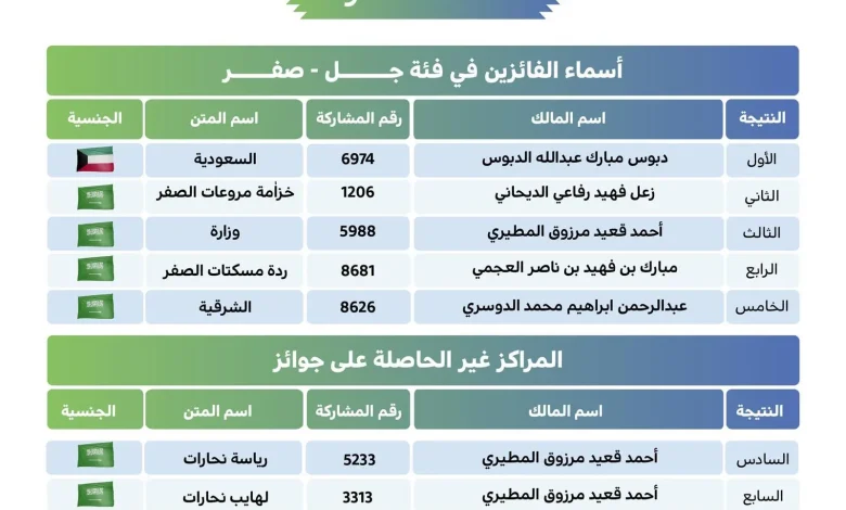 أعلنت اللجنة المنظمة لمهرجان الملك عبدالعزيز للإبل نتائج منافسات فئة جل – صفر، ضمن فعاليات مهرجان الملك عبدالعزيز للإبل في نسخته العاشرة تحت شعار “عز لأهلها” بالصياهد.