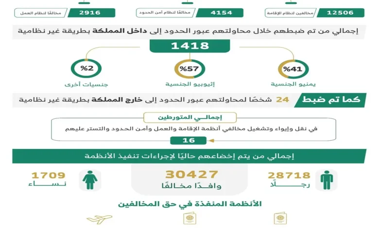 ثانيًا: بلغ إجمالي من تم ضبطهم خلال محاولتهم عبور الحدود إلى داخل المملكة (1418) شخصًا (41%) منهم يمنيو الجنسية، و(57%) إثيوبيو الجنسية، وجنسيات أخرى (2%)، كما ضُبط (24) شخصًا لمحاولتهم عبور الحدود إلى خارج المملكة بطريقة غير نظامية.
