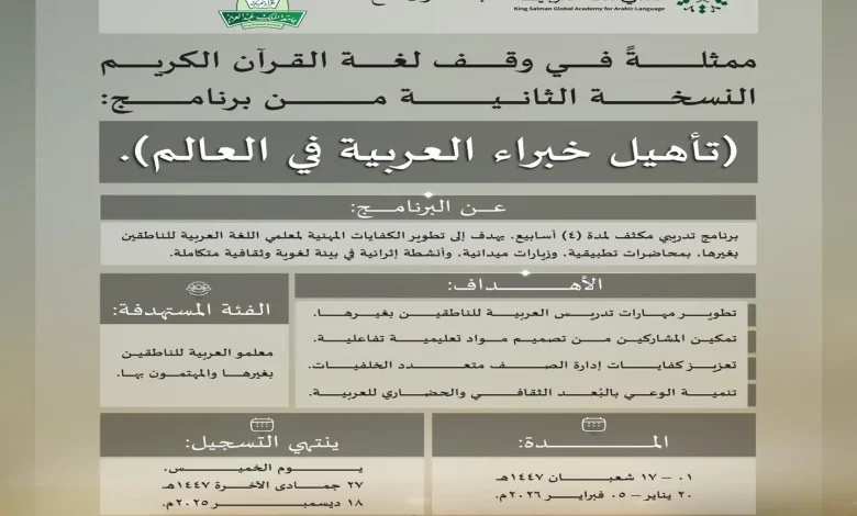 أعلن مجمع الملك سلمان العالمي للغة العربية فتح باب التسجيل في النسخة الثانية من برنامج (تأهيل خبراء العربية في العالم) بالتعاون مع جامعة الملك عبدالعزيز ممثلةً بوقف لغة القرآن الكريم، وهو برنامج مهنيّ مكثف يهدف إلى تطوير مهارات معلمي اللغة العربية للناطقين بغيرها وفق منهجيات أكاديمية متقدمة.