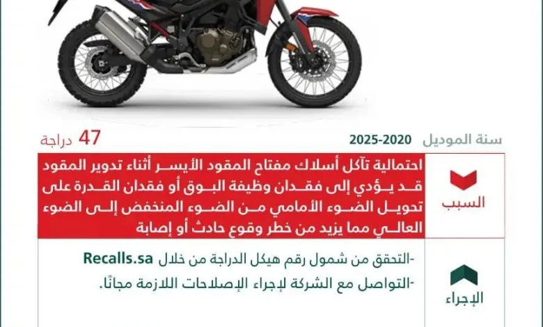 أعلنت وزارة التجارة استدعاء (47) دراجة نارية (هوندا-CRF1100) فترة الصنع من 2020 إلى 2025؛ لاحتمالية تآكل أسلاك مفتاح المقود الأيسر أثناء تدوير المقود؛ مما يؤدي إلى فقدان وظيفة جهاز التنبيه الصوتي (البوري) أو فقدان القدرة على تحويل الضوء الأمامي من الضوء المنخفض إلى الضوء العالي، ويزيد من خطر وقوع حادث أو إصابة.