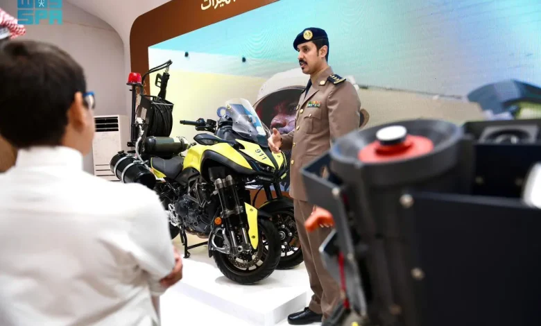 الدفاع المدني يستعرض دراجة التدخل السريع في معرض (واحة الأمن) بالصياهد