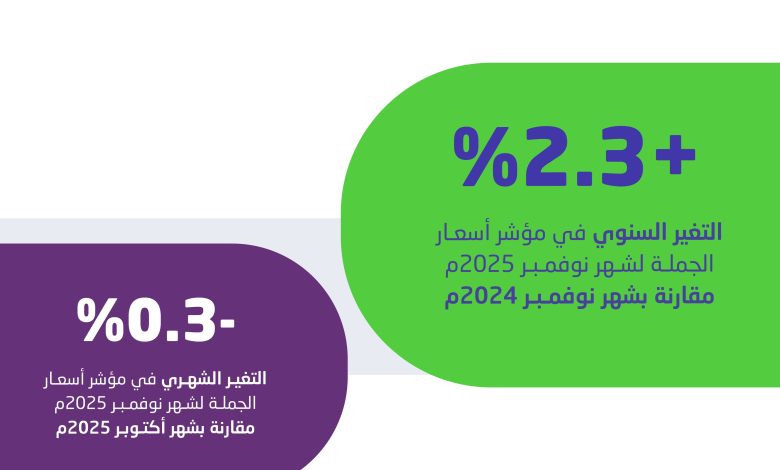 وفي السياق نفسه بلغ معدل الرقم القياسي لأسعار الجملة 2.3% خلال شهر نوفمبر 2025م مقارنة بنظيره من عام 2024م بينما سجَّل المؤشر انخفاضًا شهريًا بلغت نسبته 0.3% مقارنة بشهر أكتوبر 2025م.