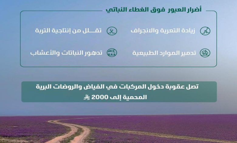 وشددت على ضرورة الالتزام بالمسارات المخصصة للمركبات، ومنع الدخول العشوائي إلى الروضات والفياض البرية والمناطق المحمية؛ بهدف حماية الغطاء النباتي والحد من التعديات التي تتسبب في تدهور البيئة واستنزاف مواردها الطبيعية.