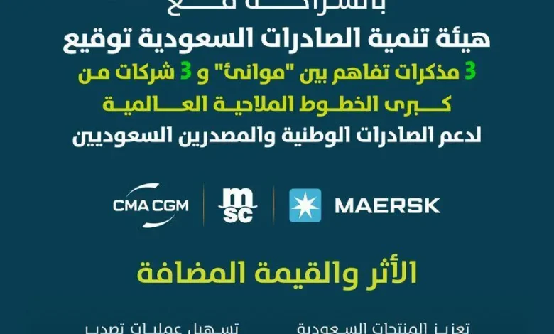 بالشراكة مع هيئة تنمية الصادرات.. توقيع 3 مذكرات تفاهم بين “موانئ” و3 شركات من كبرى الخطوط الملاحية العالمية لدعم الصادرات الوطنية والمصدرين السعوديين
