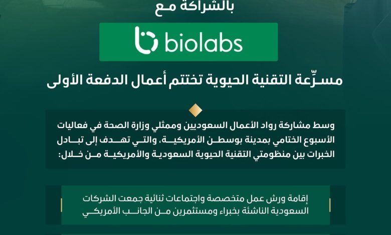 اختتمت وزارة الصحة أعمال الدفعة الأولى من مسرّعة التقنية الحيوية في مدينة بوسطن بالولايات المتحدة الأمريكية التي أطلقتها بالشراكة مع BioLabs, بمشاركة ثماني شركات سعودية ناشئة في مجالات التقنية الحيوية وعلوم الحياة في خطوة تعد الأولى من نوعها على مستوى المملكة؛ وتهدف إلى تسريع توطين الابتكار الصحي، وتحويل البحث العلمي إلى حلول تطبيقية ذات أثر مباشر على صحة الإنسان ودعم الاقتصاد الوطني.