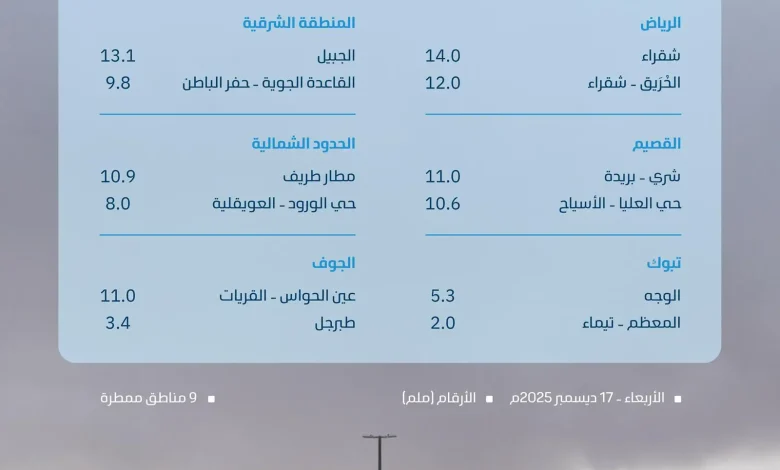 وأوضح التقرير أن منطقة الرياض سجّلت في شقراء (14) ملم، وفي الحُريق – شقراء (12) ملم، فيما سجّلت منطقة القصيم (11) ملم في شري – بريدة، وفي حي العليا – الأسياح (10.6) ملم، وفي المنطقة الشرقية سجلت الجبيل (13.1) ملم، ومحطة القاعدة الجوية – حفر الباطن (9.8) ملم، فيما سجلت منطقة عسير في وادي زيد – النماص (3.6) ملم، وفي محطة وادي الحياة – سراة عبيدة (2.2) ملم.