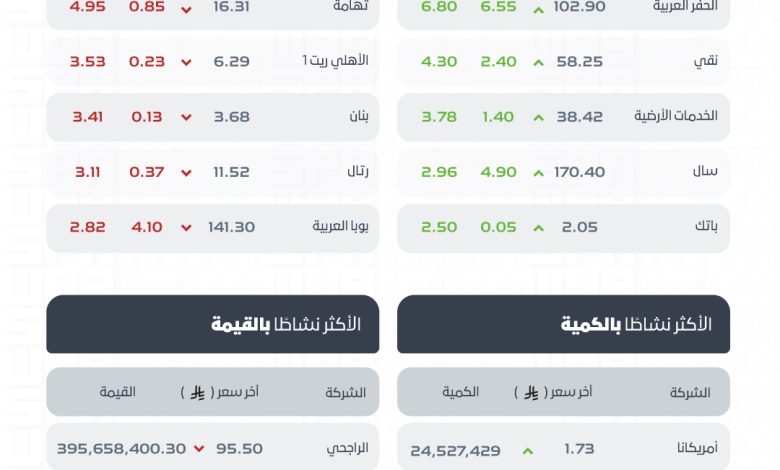 وكانت أسهم شركات أمريكانا، وأرامكو السعودية، ومهارة، والجزيرة، والراجحي هي الأكثر نشاطًا بالكمية, وكانت أسهم شركات الراجحي، وأرامكو السعودية، والأهلي، والحفر العربية، وstc هي الأكثر نشاطًا في القيمة.
