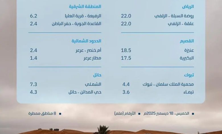 وأوضح التقرير أن منطقة الرياض سجّلت (22,0) ملم في كلٍ من علقة، وروضة السبلة بالزلفي، و(19,0) ملم في الزلفي، و(18,0) ملم في البطين الجنوبي بالزلفي، و(7.6) ملم في حي النظيم بالرياض، و(6,0) ملم في حي المصانع بالرياض، و(5,4) ملم في تمير بالمجمعة، و(5,0) ملم في المجمعة، و(4,2) ملم في الطوقي برماح, فيما سجّلت منطقة حائل (7,3) ملم في الشملي، و(4,3) ملم في حي المدائن بحائل، و(3,6) ملم في حائل، و(3,4) ملم في عقدة بحائل، و(2,4) ملم في مزارع شركة نادك بالجثاثية ببقعاء.