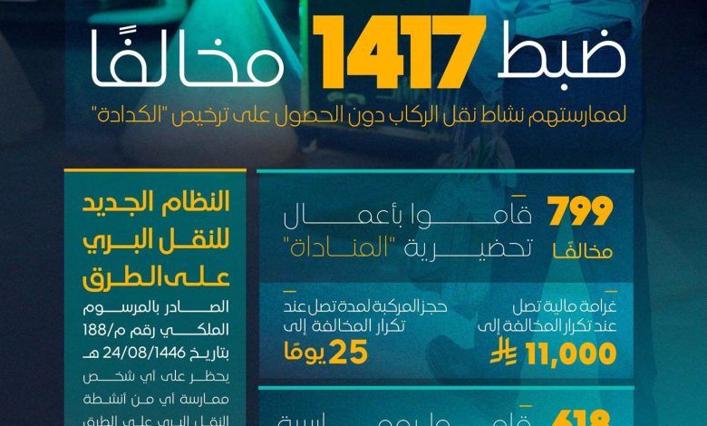 وأشارت الهيئة إلى أن النظام الجديد للنقل البري الجديد على الطرق، الصادر بالمرسوم الملكي رقم (م/188) وتاريخ (1446/08/24هـ)، شدد على منع ممارسة النقل دون ترخيص نظامي، ونصت العقوبات عند تكرار المخالفات على غرامات مالية تصل إلى (11) ألف ريال مع حجز المركبة لمدة (25) يومًا بحق من يقوم بالأعمال التحضيرية “المناداة”، فيما تصل العقوبات إلى غرامة قدرها (20) ألف ريال وحجز المركبة لمدة تصل إلى (60) يومًا بحق من يزاول النقل غير النظامي، مع إمكانية بيع المركبة المخالفة في مزاد علني وإبعاد غير السعودي في حال تكرار المخالفة.