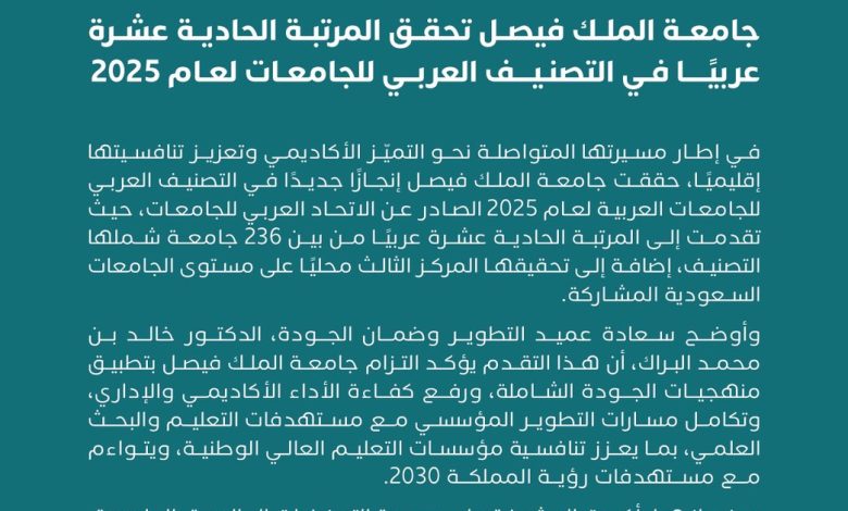 ويجسّد هذا الإنجاز المكانة المتقدمة لجامعة الملك فيصل ضمن الجامعات العربية الرائدة، ودورها المحوري في تطوير منظومة التعليم العالي، وتعزيز حضورها الأكاديمي والبحثي إقليميًا ودوليًا، بما يتوافق مع توجهات الدولة في دعم الجامعات الوطنية ورفع تنافسيتها عالميًا.