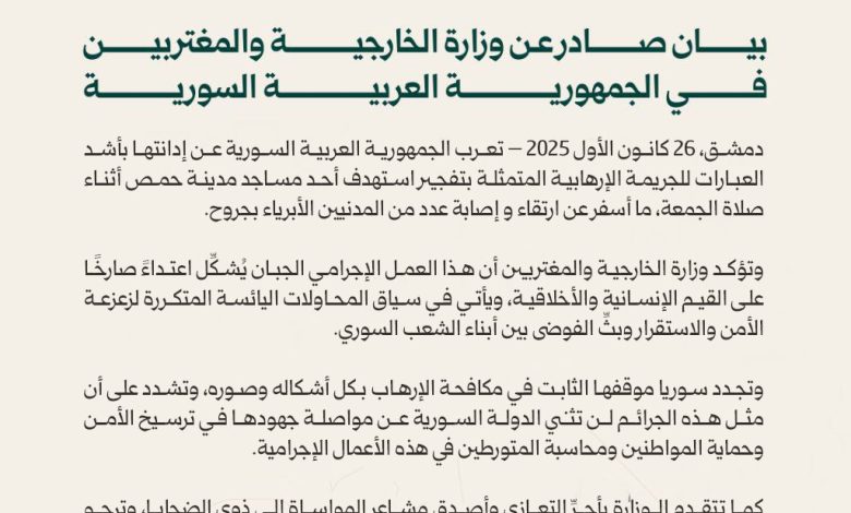أكدت سوريا، اليوم، أن تفجير المسجد -في مدينة حمص- الذي نتج عنه مقتل (8) أشخاص على الأقل، يأتي في سياق “المحاولات اليائسة” لزعزعة الأمن والاستقرار.