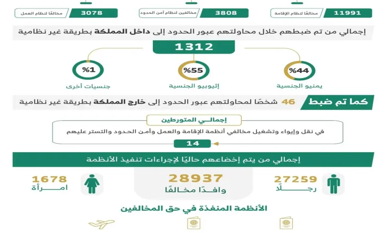ثانيًا: بلغ إجمالي من تم ضبطهم خلال محاولتهم عبور الحدود إلى داخل المملكة (1312) شخصًا (44%) منهم يمنيو الجنسية، و(55%) إثيوبيو الجنسية، وجنسيات أخرى (01%)، كما تم ضبط (46) شخصًا لمحاولتهم عبور الحدود إلى خارج المملكة بطريقة غير نظامية.