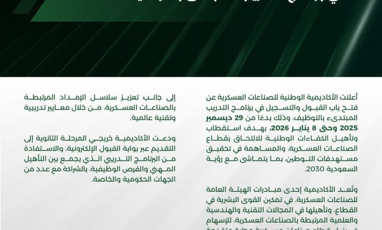 أعلنت الأكاديمية الوطنية للصناعات العسكرية عن فتح باب القبول والتسجيل في برنامج التدريب المبتدئ بالتوظيف، وذلك بدءًا من اليوم وحتى 8 يناير 2026؛ بهدف استقطاب وتأهيل الكفاءات الوطنية للالتحاق بقطاع الصناعات العسكرية، والإسهام في تحقيق مستهدفات التوطين، بما يتماشى مع رؤية المملكة 2030.