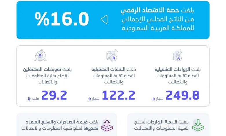أظهرت نتائج مسح الاقتصاد الرقمي لعام 2024 ارتفاع حصة الاقتصاد الرقمي من الناتج المحلي الإجمالي في المملكة، حيث وصل إلى (16.0%) مقارنةً بـ(15.6%) في عام 2023، وذلك بزيادة بلغت (0.4) نقطة مئوية، ووفقًا لمستويات الاقتصاد الرقمي.