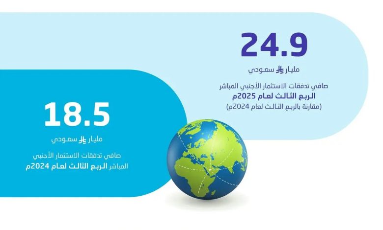 أظهرت نتائج الاستثمار الأجنبي المباشر بالربع الثالث من عام 2025م أن قيمة صافي التدفقات بلغت (24.9) مليار ريال سعودي، وذلك بنسبة ارتفاع بلغت (34.5%) مقارنةً بالربع المماثل من العام الماضي، حيث كانت (18.5) مليار ريال سعودي، فيما سجلت ارتفاعًا نسبته (5.2%) مقارنةً بالربع السابق من نفس العام، إذ بلغت قيمة صافي التدفقات (23.7) مليار ريال سعودي، وذلك حسب نشرة إحصاءات الاستثمار الأجنبي المباشر للربع الثالث من 2025 الصادرة من الهيئة العامة.