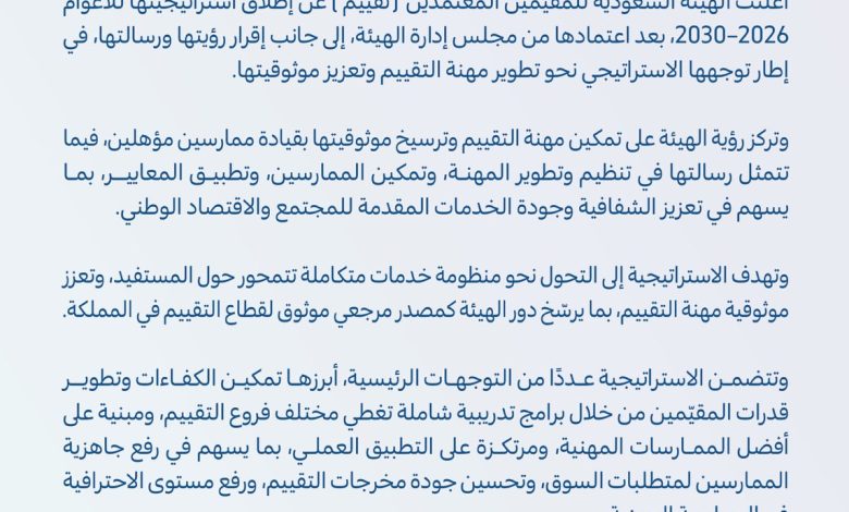 وأكدت الهيئة أن الإستراتيجية المعتمدة تمثل مرحلة تحول نوعية في مسيرتها التنظيمية والمهنية، وتشكل إطارًا شاملًا لقيادة تطوير قطاع التقييم في المملكة خلال المرحلة المقبلة، بما يعزز الثقة في مخرجات التقييم، ويدعم مكانة المملكة إقليميًا ودوليًا في هذا القطاع.