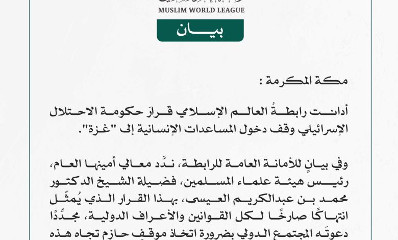 أدانت رابطةُ العالم الإسلامي، باستنكارٍ شديدٍ، قرارَ حكومة الاحتلال الإسرائيلي بمنعِ عشرات المنظمات الإنسانية غير الحكومية من العمل في قطاع غزّة، والتي تُعَدّ شريانًا حيويًّا لبقاء سكان القطاع.