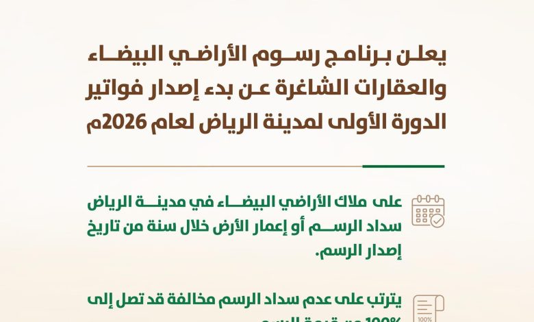 وأوضحت الوزارة أن إصدار الفواتير جاء إنفاذًا لأحكام نظام رسوم الأراضي البيضاء والعقارات الشاغرة واللائحة التنفيذية لرسوم الأراضي البيضاء، وذلك بعد استكمال جميع الإجراءات التنظيمية والفنية، واستنادًا إلى النطاقات الجغرافية المعتمدة لتطبيق الرسوم، وبما يتوافق مع الشرائح المحددة في اللائحة التنفيذية، مؤكدةً أن التطبيق يتم وفق ضوابط واضحة ومعايير نظامية تحقق العدالة والشفافية.