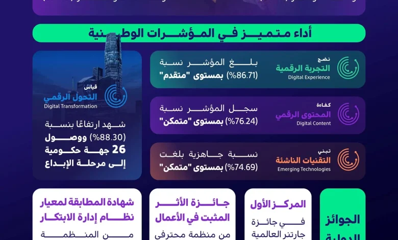 وسجلت الجهات الحكومية في مؤشر نضج التجربة الرقمية مستوى متقدمًا بنسبة 86.71%، كما وصلت 26 جهة حكومية إلى مرحلة الإبداع، وارتفع مستوى الجهات في مؤشر قياس التحول الرقمي إلى 88.30%، فيما بلغت نسبة 76.24% في مؤشر كفاءة المحتوى الرقمي، وهو ما شكّل أساسًا عمليًّا لتوجيه الدعم، وبناء خطط تحسين مخصصة، وتحفيز التنافس الإيجابي بين الجهات.