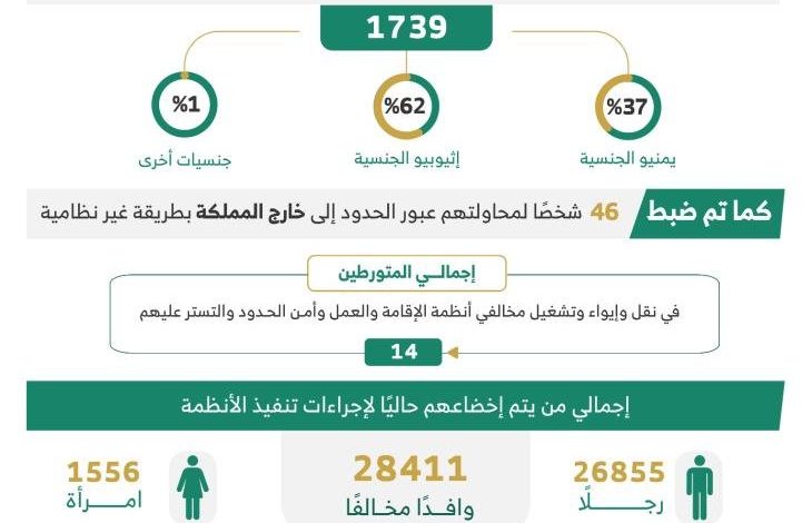 ثانيًا: بلغ إجمالي من تم ضبطهم خلال محاولتهم عبور الحدود إلى داخل المملكة (1739) شخصًا (37%) منهم يمنيو الجنسية، و(62%) إثيوبيو الجنسية، وجنسيات أخرى (01%)، كما تم ضبط (46) شخصًا لمحاولتهم عبور الحدود إلى خارج المملكة بطريقة غير نظامية.