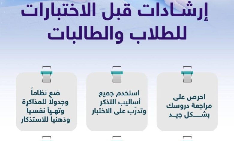 وأوضحت الإدارة العامة للتعليم بمنطقة عسير، أن المدارس أنهت استعداداتها كافة لتهيئة بيئة تعليمية مناسبة تُمكِّن الطلبة من أداء اختباراتهم بهدوء وسلاسة، من خلال تجهيز مقار الاختبارات، وإعداد جداول الاختبارات وما يتصل بها، وتجهيز غرف التحكم (الكنترول)، إلى جانب تطبيق الإرشادات الصحية، ومتطلبات الأمن والسلامة، وخدمات التوجيه الطلابي، والصحة المدرسية.