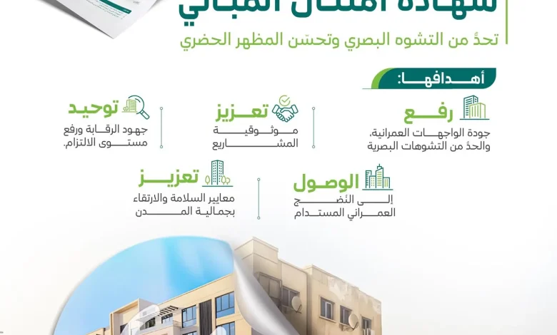 أطلقت وزارة البلديات والإسكان المرحلة الثانية من مبادرة “شهادة امتثال المباني”، في إطار جهودها المستمرة للارتقاء بجودة المشهد الحضري في مدن المملكة، وتنظيم البيئة العمرانية وفق معايير واضحة تسهم في الحد من مظاهر التشوه البصري، وتحقيق مستهدفات رؤية المملكة 2030 في تحسين جودة الحياة وتعزيز الامتثال للأنظمة العمرانية.