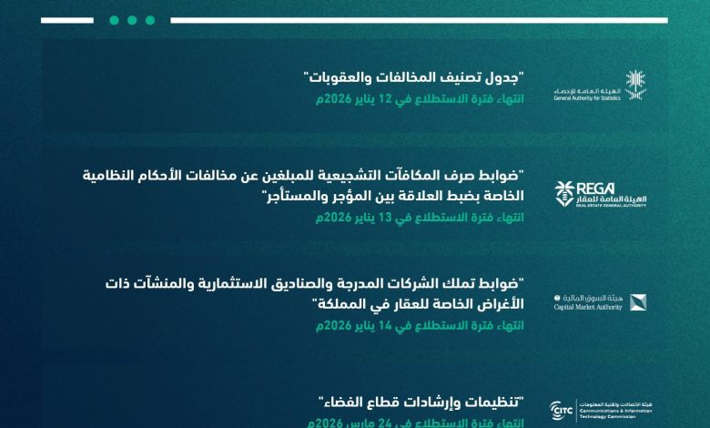 من جانبها طرحت الهيئة العامة للعقار عبر المنصة مشروع (ضوابط صرف المكافآت التشجيعية للمبلغين عن مخالفات الأحكام النظامية الخاصة بضبط العلاقة بين المؤجر والمستأجر)؛ بهدف تنظيم إجراءات صرف المكافآت التشجيعية للمبلغين عن مخالفات الأحكام النظامية الخاصة بضبط العلاقة بين المؤجر والمستأجر، بما يضمن العدالة والشفافية وحماية حقوق الأطراف المعنية، وينتهي الاستطلاع على المشروع بتاريخ 13 يناير 2026م.