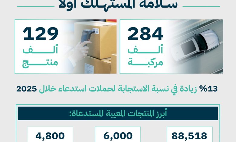 نفذت وزارة التجارة (173) حملة استدعاء منتجات وسلع معيبة خلال العام 2025م، شملت استدعاء (284) ألف مركبة معيبة، و(129) ألف منتج استهلاكي معيب.
