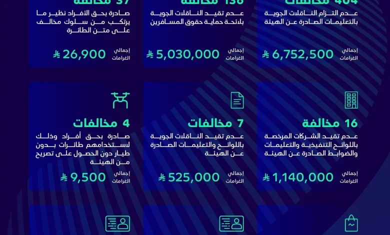 كما أصدرت اللجنة (136) مخالفة مرصودة على الناقلات الجوية وذلك لعدم تقيدها بلائحة حماية حقوق المسافرين، وبلغ إجمالي قيمة الغرامات أكثر من (5) ملايين ريال، و(16) مخالفة بحق الشركات المرخصة؛ وذلك لعدم تقيدها باللوائح التنفيذية والتعليمات والضوابط الصادرة عن الهيئة، وبلغ إجمالي قيمة الغرامات أكثر من (1.1) مليون ومئة ألف ريال، إضافة إلى (3) مخالفات صادرة بحق شركات قامت باستخدام طائرات بدون طيار دون الحصول على تصريح من الهيئة، حيث بلغ إجمالي غرامتها (30) ثلاثين ألف ريال.