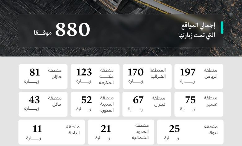 نفذت وزارة الصناعة والثروة المعدنية، ممثلة في وكالة الإشراف على العمليات التعدينية، 880 جولة رقابية على عددٍ من المواقع التعدينية، في مختلف مناطق المملكة خلال شهر نوفمبر 2025.