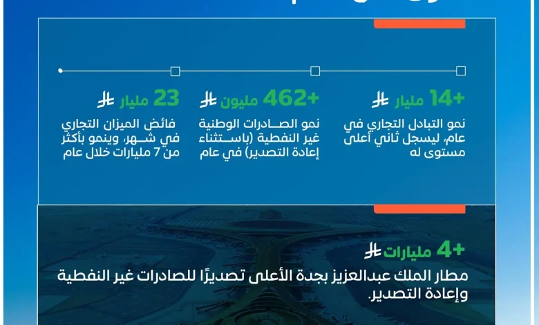 وبيّنت الإحصاءات تحقيق الميزان التجاري للمملكة فائضًا قدره (23.9) مليار ريال خلال شهر أكتوبر (2025م)، محققًا نموًا سنويًا بنسبة (47.4%)، وبزيادة تجاوزت (7) مليارات ريال، مقارنةً بفائض بلغ (16.2) مليار ريال للفترة المماثلة من العام الماضي.