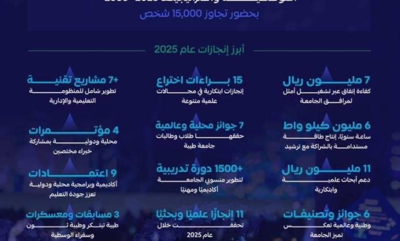 كما نظّمت الجامعة 4 مؤتمرات محلية ودولية بمشاركة خبراء ومختصين، وأطلقت 3 مسابقات ومعسكرات طبية تعنى بالابتكار الوطني، وحققت 11 إنجازًا علميًا وبحثيًا خلال عام 2025م.