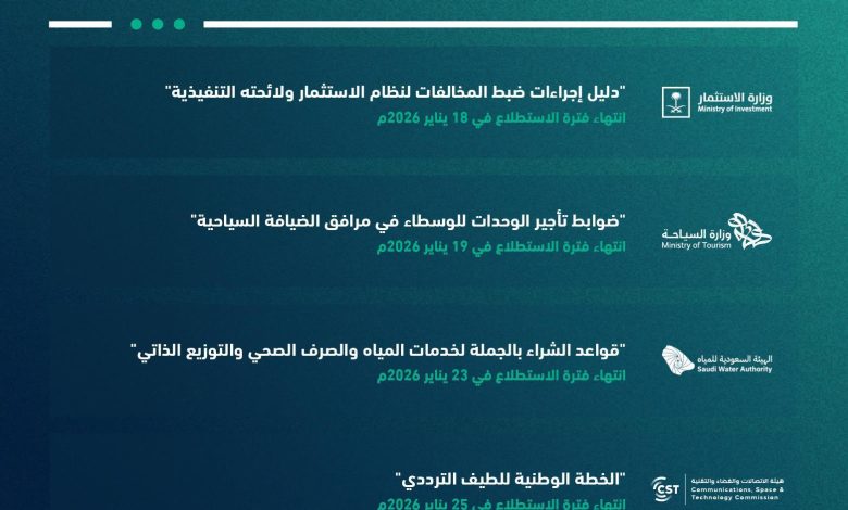وتضمنت المشروعات المطروحة عبر المنصة، مشروع (دليل إجراءات ضبط المخالفات لنظام الاستثمار ولائحته التنفيذية)؛ الذي تهدف من خلاله وزارة الاستثمار إلى تحديد الإجراءات الواجب على مسؤولي الضبط اتباعها عند ارتكاب المستثمر لمخالفات أحكام نظام الاستثمار ولائحته التنفيذية والمخالفات الواردة في دليل المستثمر، وينتهي الاستطلاع على المشروع بتاريخ 18 يناير 2026م.