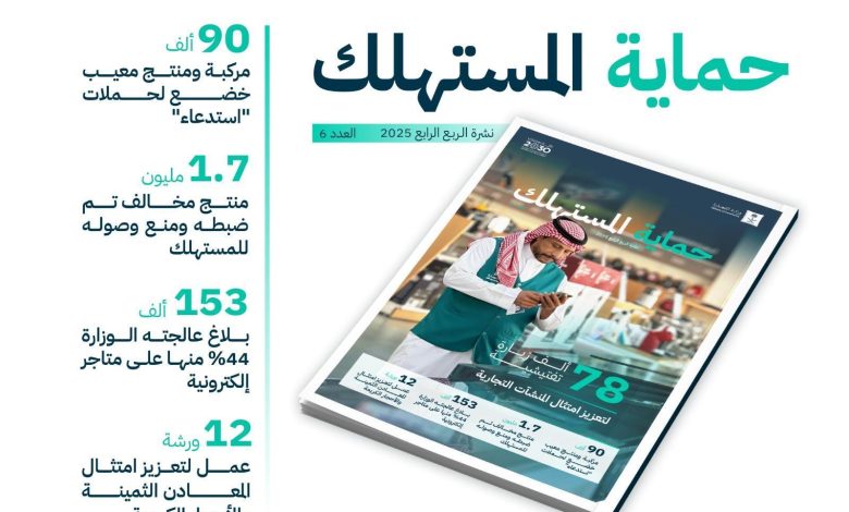 أصدرت وزارة التجارة نشرتها الربعية لحماية المستهلك عن الربع الرابع 2025، متضمنة أبرز الأعمال والجهود في مجالات مكافحة الغش التجاري ومكافحة التستر التجاري والتجارة الإلكترونية وغيرها.