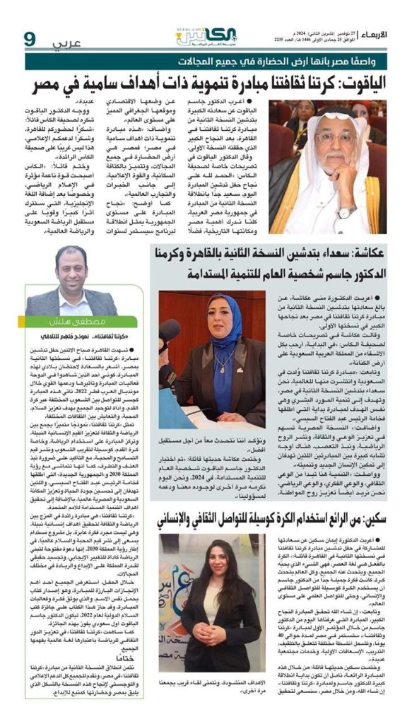 وأشاد الدكتور الياقوت بما قدمه معالي الدكتور أشرف صبحي من دعم ملموس وجهود بارزة أسهمت في إنجاح النسخة الثانية من مبادرة «كرتنا ثقافتنا» في مصر، بعد النجاح الكبير الذي حققته النسخة الأولى في المملكة العربية السعودية، مؤكدًا أن هذا الدعم كان له أثر واضح في تعزيز رسالة المبادرة وأهدافها الثقافية والرياضية.