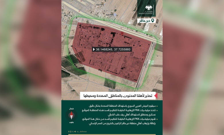 وكانت هيئة العمليات قد نشرت في وقت سابق أربعة مواقع لتمركز ميليشيات (PKK) الإرهابية وفلول النظام السابق حلفاء تنظيم قسد في دير حافر، محذرة الأهالي بضرورة الابتعاد عنها.