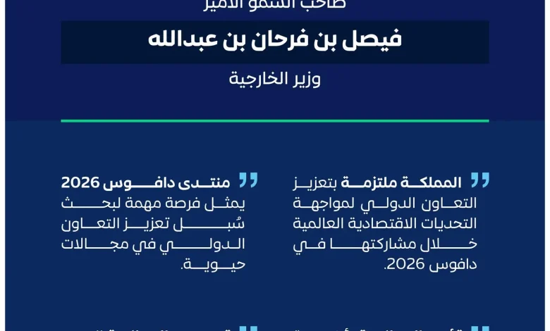 سمو وزير الخارجية: المملكة ملتزمة بتعزيز التعاون الدولي لمواجهة التحديات الاقتصادية العالمية خلال مشاركتها في دافوس 2026