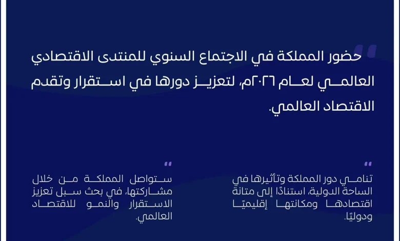 وأشار معاليه في تصريح لوكالة الأنباء السعودية “واس”، إلى تنامي دور المملكة وتأثيرها في الساحة الدولية، استنادًا إلى متانة اقتصادها ومكانتها إقليميًا ودوليًا، الأمر الذي يعزز من إسهامها في صياغة السياسات وتوجهات الاقتصاد العالمي، مؤكدًا أنَّ المملكة ستواصل من خلال مشاركتها، بحث سبل تعزيز الاستقرار والنمو للاقتصاد العالمي، ضمن هذه المنصة العالمية التي تجمع صناع القرار من الحكومات وقطاع الأعمال والأوساط العلمية والأكاديمية.