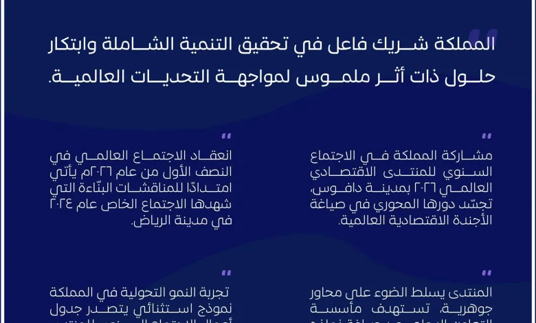 وأكد معاليه في ختام تصريحه أن مشاركة المملكة لا تقتصر على التمثيل الدولي، بل تمتد إلى الإسهام الفاعل في دفع مسارات التعاون وتعزيز مرونة الاقتصاد العالمي، مع التركيز على تحقيق توازن مدروس بين التوسع التنموي وسياسات الابتكار المسؤول، مفيدًا أن المملكة تمضي بخطى واثقة نحو قيادة حوار دولي يرتكز على ابتكار نماذج اقتصادية مستدامة، وتبادل الخبرات التي تعزز تنافسية الاقتصاد الوطني، وتسهم في إرساء أسس راسخة لاقتصاد عالمي أكثر استقرارًا وقدرة على مواجهة التحديات المستقبلية.