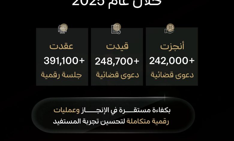 أنجز ديوان المظالم خلال عام 2025م، (242,076) دعوى قضائية، وقيّد (248,773) دعوى؛ لتصل نسبة إنجاز الدعاوى خلال العام ذاته (97%)، فيما عُقدت خلال العام نفسه (391,132) جلسة قضائية، بارتفاعٍ بلغ (109,532) جلسة قضائية عن عام 2024.