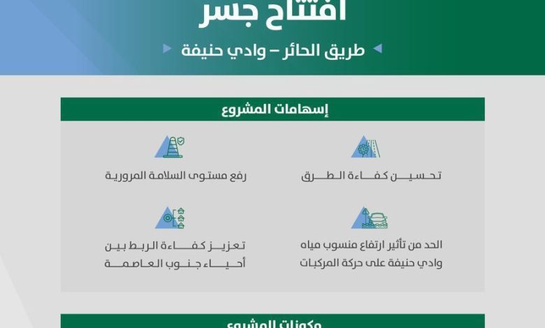 افتتحت أمانة منطقة الرياض بشكل كلي جسر طريق الحائر عند تقاطعه مع وادي حنيفة، ضمن مشاريع تحسين شبكة الطرق ورفع كفاءة الحركة المرورية جنوب العاصمة.