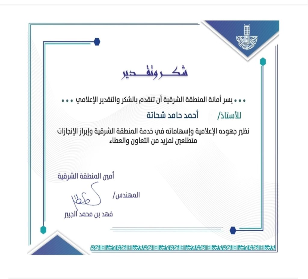 وقد وقّع شهادة الشكر أمين المنطقة الشرقية المهندس فهد بن محمد الجبير، مشيدًا بما تحقق من تعاون إعلامي مثمر يخدم المصلحة العامة.