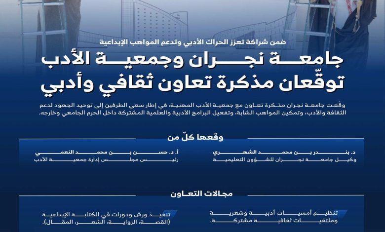 جامعة نجران وجمعية الأدب المهنية توقّعان مذكرة تعاون ثقافي وأدبي