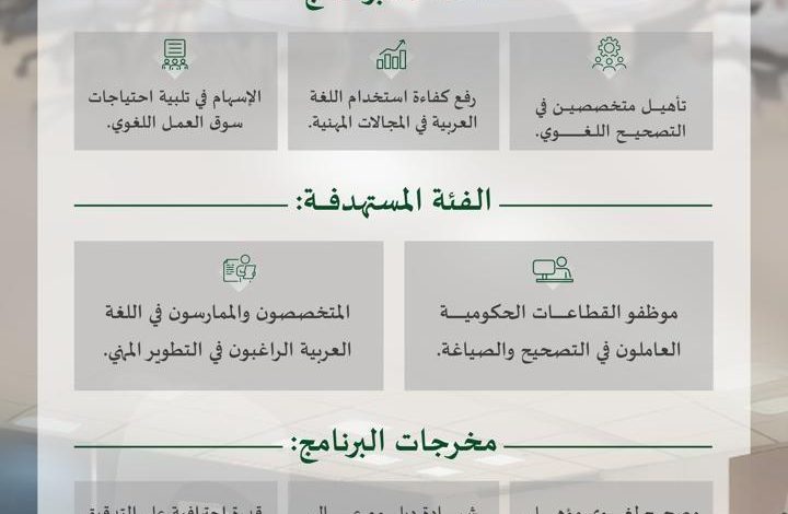 ويهدف البرنامج إلى تعزيز دور اللغة العربية في المجالات المهنية، ورفع كفاءة استخدامها في الجهات والمؤسسات الحكومية، والإسهام في تلبية متطلبات سوق العمل واحتياجاته التنموية والمجتمعية وفق التصنيف السعودي الموحّد للمهن.