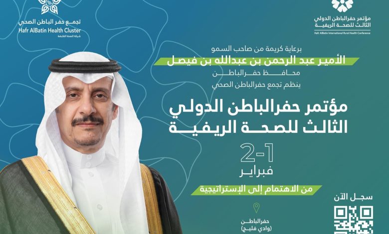 يرعى صاحب السمو الأمير عبدالرحمن بن عبدالله بن فيصل محافظ حفر الباطن، مؤتمر حفر الباطن الدولي للصحة الريفية في نسخته الثالثة، الذي ينظمه تجمع حفر الباطن الصحي يومي 1 – 2 فبراير 2026م تحت شعار “من الاهتمام إلى الإستراتيجية”، بمشاركة عدد من الجهات المحلية والدولية المهتمة بقطاع الصحة الريفية.
