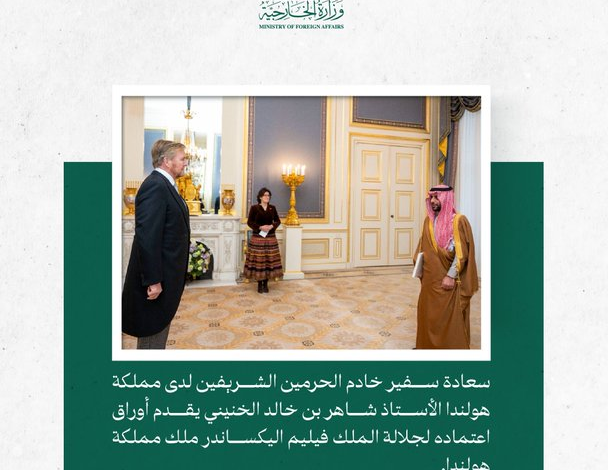 قدم سفير خادم الحرمين الشريفين لدى مملكة هولندا شاهر بن خالد الخنيني، أوراق اعتماده لجلالة الملك فيليم أليكساندر ملك مملكة هولندا، وذلك خلال استقبال جلالته له بقصر نوردايندة في العاصمة الهولندية لاهاي اليوم.