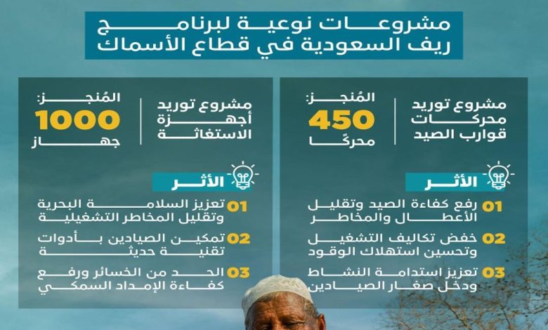أطلق برنامج التنمية الريفية الزراعية المستدامة “ريف السعودية”، مشروعًا لتزويد قوارب الصيد الخاصة بصغار الصيادين، بمحركات بحرية جديدة ذات كفاءة عالية، وأجهزة استغاثة عبر الأقمار الصناعية (EPIRB)، وتركيبها وفق أعلى معايير السلامة البحرية؛ تحقيقًا للأهداف التنموية والإستراتيجية التي تتكامل مع مستهدفات البرنامج لرفع كفاءة الإنتاج، وتحسين السلامة، وتعزيز الاستدامة والتنمية الاقتصادية، وفقًا لمستهدفات رؤية المملكة 2030.