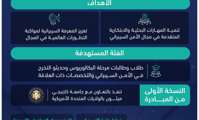 وأوضحت الهيئة أن المبادرة تأتي ضمن “البرنامج الوطني للبحث والتطوير والابتكار في الأمن السيبراني” أحد الممكنات الرئيسة لاستشراف التحديات السيبرانية وتعزيز البحث العلمي والابتكارات الواعدة في مجالات الأمن السيبراني، وفي إطار مبادراتها الإستراتيجية الرامية إلى تنمية قطاع الأمن السيبراني على المستوى الوطني، كما تستهدف طلاب وطالبات مرحلة البكالوريوس وحديثي التخرج في الأمن السيبراني والتخصصات ذات العلاقة، وتنفذ نسختها الأولى بالتعاون مع جامعة “كارنيجي ميلون” على مدى 10 أسابيع بالولايات المتحدة الأمريكية، تحت إشراف نخبة من الخبراء والباحثين الدوليين المتخصصين في المجال.